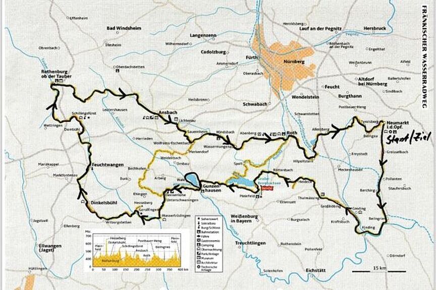 Der Fränkische Wasserradweg (FWR), eine Rundtour durch Bayerns Mitte, mit Start und Ziel in Neumarkt in der Oberpfalz.