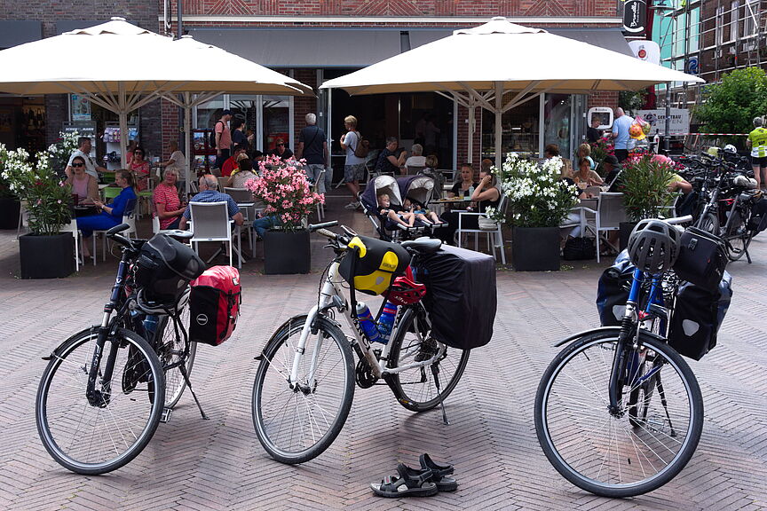 Da stehen sie nun vor meiner Haustür: meine drei Mitradler für die kommende Woche auf unserer Radtour durch das nördliche NRW und das westliche Niedersachsen. Abweichend von unseren Touren in den letzten Jahren wird diesmal keinerlei Anreise benötigt; stattdessen starten wir mit unseren relativ schwer bepackten Tourenrädern direkt von zuhause aus.